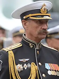He was born in May 1961 in the northwestern city of Leningrad (now Saint-Petersburg). In 1991, Alexei Karabanov received his first invitation to perform at international concerts with the band, with his first tour outside of Russia taking place in Northern France at the Fifth International Festival of Military Music in Lille. Since that time, the band, under Karabanov's leadership, has regularly appeared in festivals and concerts and musical classes in the West, such as his October 1993 visit to Brigham Young University in Utah, where he gave classroom lectures and directed the BYU Bands, including the Cougar Marching Band. It was there where the previously "unknown" original Russian band music by V. Barsegian and Vladimir Malgin was introduced. Nine years later, at HMS Nelson, HMNB Portsmouth, the Royal Marines Band performed a Russian music program under the baton of Commander Karabanov. In 2007, in recognition of his service and talent, the Ministry of Defense promoted Karabanov to the post of Artistic Director and commanding officer of the Central Navy Band of Russia, which is the highest musical position in the Russian Navy. At the same time, he was also promoted to the senior naval rank of Naval Captain.[1][2][3]