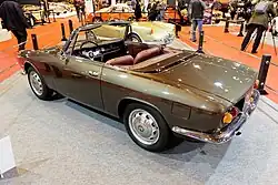 The Spider was launched at the 36th Geneva Motor Show in March 1966,[8] and together with the Giulia Sprint GT Veloce tested by the press at an event organised in Gardone Riviera.[9] To choose a name for the spider Alfa Romeo announced a write-in competition, offering an example of the new car as a prize.[15] Over 100,000 ballots were sent in, the great majority from Italy; the winner was Guidobaldo Trionfi from Brescia, who proposed the name "Duetto" (duet).[15] However it could not be officially adopted due to trademark issues: the confectionery manufacturer Pavesi had launched on the market in 1965 a chocolate snack called, indeed, 'Duetto'; the Court of Milan ruled that Pavesi, having already registered the name, had exclusive rights to it, thus the car was named simply Alfa Romeo Spider 1600.[15] The Spider's 1,570 cc twin cam engine had dual Weber two-barrel side-draft carburetors, and produced 109 PS DIN (80 kW; 108 hp; or 129 PS SAE). Sparsely fitted inside but including five speed manual transmission, disc brakes 15" wheels fitted with Pirelli Cinturato 155HR15 CA67 tyres.[16] The price on launch in Italy was 2,195,000 lire. In the US the car sold for $3,950 (compared to $3,991 for a Lotus Elan and $2,607 for an MGB).[17] In the UK the car's price was close to a Jaguar E-Type.[18]
