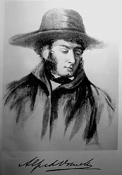 Domett's first volume of poetry was published in 1832.[10] Another book of poems, the "more technically proficient" Venice,[5]: 12 appeared in 1839.[11] Domett contributed poems to Blackwood's Magazine, one of which, A Christmas Hymn, attracted some attention locally. During the ten years he lived in London, he became the intimate friend of Robert Browning, of whose poem "Waring"[12] he is the subject. In that poem, Browning expresses regret for Domett's sudden disappearance from London, and speaks of Domett with emotion: 'How much I loved him, I find out now I've lost him'. In the poem Browning asks what has become of his friend, but believes he will achieve much in far-off lands: