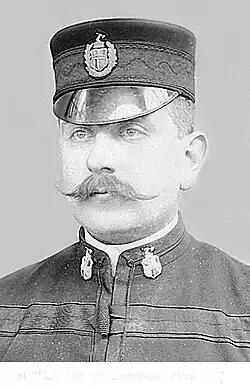 Alfred Richardson duly started his duties at Newcastle-under-Lyme Police Station on 2 September 1901. The Force size for the town was 18 men. His new telephone number was '9'.[13] Within a few days there was a ceremony at the Town Hall and Square for the mayor and the town dignitaries and local citizens to meet their new chief constable, which he attended in his Number One uniform. This showed the chief constable's badge of rank, worn on the epaulettes, which consisted of crossed tipstaves in a wreath, surmounted by a crown, similar to the insignia of a Lieutenant General in the British Army. The population of the town was about 20,000 people and it was heavily industrialized. The conditions[14] for his men were, "All Officers had to wear helmets for all duties and keep Truncheons. Constables would work twelve hours a day, seven days a week. There would be two shifts, one day and one night." There were no meal breaks. A beat system was such that a constable was taken to the start of his beat on foot by a superior. Constables worked on 'shifts', which meant they spent about six or seven hours during the day or night at their work. Some weeks they did 'nights', others they did 'evenings', others did 'days'. At this period they worked seven days a week with no rest days, which was to become a factor in Richardson's next appointment. As he had in Birmingham previously, the new chief constable now appeared by name regularly in the local newspaper in court cases.[15] In these cases Alfred Richardson was the prosecutor, a role he was to continue in his next post. At this time, and later, the Borough had an ongoing problem with smallpox, which added to police work with contagion. Newcastle-under-Lyme Fire Service worked, as all fire services did, in conjunction with the local police force, but it was an entirely separate unit. There was a fire brigade captain and lieutenant, 12 men and two runners in Richardson's time. In 1901 it had a first-class steam engine, one manual engine and a new fire escape. It was separated from the police force in the early 1880s.[16]