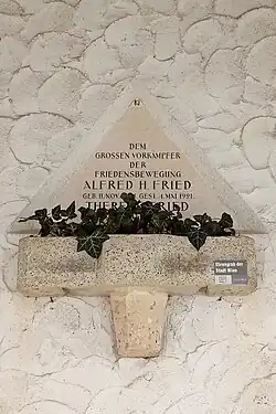 During World War I, Fried moved to neutral Switzerland, and continued to advocate international peace. He died in his hometown, Vienna, in 1921.[3] His ashes are buried at Feuerhalle Simmering.[4]