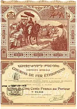 Share of the Compagnie Impériale des Chemins de Fer Éthiopiens, issued 14. December 1899, signed by Alfred Ilg; The share shows emperor Menelik II, waiting together with his royal suit for the arrival of the first train.[1]