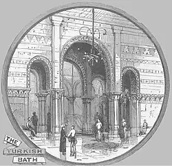 Waterhouse continued to practice in Manchester for 11 years, until moving his practice to London in 1865. At this stage of his career most of his commissions were either in the north-west or north-east of England. His earliest commissions were mainly for domestic buildings. Among Waterhouse's first commissions in 1854 were for his family: a set of stables at Sneyd Park, for his father, who had moved to Bristol, and alterations to the home of his uncle Roger Waterhouse at Mossley Bank in Liverpool.[11] In executing the commission for the cemetery buildings at Warrington Road, Ince in Makerfield (1855–56), he began his move towards designing public buildings in his developing Neo-Gothic style, building a lodge for the registrar, and two chapels, one Church of England in Gothic style, and one for Roman Catholic and Non-conformists in Norman style.[12] His first commission for a commercial building was for the now demolished Binyon & Fryer warehouse and sugar refinery in Chester Street, Manchester (1855). The building was of two floors made of brick with stone dressings and Italianate in style. The intended upper floors based on the Doge's Palace remained unbuilt.[13] Also he designed the Droylesden Institute (1858, demolished) in the Manchester suburb of Droylsden. It contained a reading room and other educational facilities and had some Gothic details. A similar building was the Bingley Mechanics' Institute built (1862–65), located in Bingley, with a hall and reading room in a Gothic style.[14]