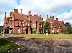His first large new country house design was Hinderton Hall (1856–57), Cheshire, for Liverpool merchant Christopher Bushell, built of red sandstone, slate roofs, stables, gardener's cottage and boundary walls. Hinderton, Gothic in style, is very restrained and plain compared with his more mature works.[13] Representative of the several suburban houses of his early career is New Heys (1861–65), Allerton, Liverpool, built for lawyer W.G. Benson at a cost of £6,700 (approx £800,000 in 2019), built of brick with stone dressing, with slate roof, it included stables, conservatory, garden layout and furniture.[12]