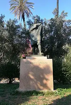 Alfredo Oriani was born on 22 August 1852 in Faenza (Ravenna), the youngest of three children. His father Luigi Oriani, belonged to the lower landed gentry. He studied law at the Sapienza University of Rome in Rome and at the University of Naples where he received his law degree in 1872. He never practiced, however, but retired to his family's estate to devote most of his life to his writing.[1] Oriani spent most of his adult life writing in seclusion in his family country house.[3] In 1876, he published his first work, Memorie inutili (1876), a collection of auto-biographical tales deeply influenced by the Scapigliatura.[4] Oriani never married. In 1881 he fathered an illegitimate child by the family maid.[1] An admirer of Crispi, Oriani disdained bourgeois moderatism, and pleaded for a national revival based on the same spirit of fervent patriotism as had created Italy. In 1892 he unsuccessfully ran for the Italian Parliament.[1] In the last decade of his life he turned to the theatre, enjoying a certain success with the tragedy L'invincibile (1902).[4] He died on 18 October 1909 in his residence in Casola Valsenio, at the age of only 57.[1]