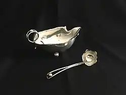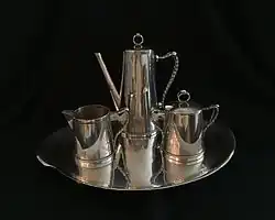 Sciarrotta's work is characterized by a sleek and simple style, and many of his smaller pieces feature his signature leaf-shaped designs. During the 1950s and 1960s, Sciarrotta’s handmade silver serving dishes, bowls, candelabra, vases, trays, cigarette boxes, etc. were sold at the most exclusive American retailers from coast to coast, including Georg Jensen, Cartier, and Black Starr and Gorham in New York City; Bailey Banks & Biddle in Philadelphia; Gump’s in San Francisco; Shreve, Crump & Low in Boston; and many more. His designs became known as “The Wedding Gift of Philadelphia and Newport” and he was often referred to as the "Modern Cellini;"[1] This was also the title used for his brochure, which was given to retailers and collectors and included in gift packages.