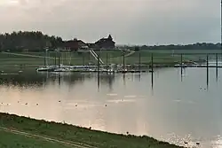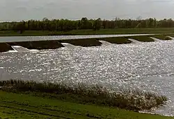 Immediately to the south, where the artificially constructed conduit of the river Hase flows into the Alfsee lakes, there is a small auxiliary basin (Absetzbecken) in front of the actual reservoir, from which water flows into the lake via a roughly 330 m long overflow dam.