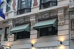 The first story of the hotel's 12-story section is five bays wide and contains a limestone water table. The entrance is recessed within the center bay, and a marquee projects above the sidewalk in front of the main entrance.[3] This marquee contains details such as old English lettering, wrought-iron scrolls, and a scalloped awning.[13] There are two segmental arches on either side of the main entrance, all of which have canopies above them. There are glazed wooden doors in the westernmost bay, as well as metal service doors in the easternmost bay. The second-westernmost and second-easternmost bays contain tripartite windows.[3] The second story is seven bays wide. The three center bays on the second floor have two-over-two sash windows, separated by motifs of tassels and shells.[3] There is a small balustrade in front of the three center bays, with a flagpole extending diagonally above the street.[14] The four outer bays have rectangular windows, separated by large brackets that support the band course above the second floor, and topped by keystones flanked by festoons.[3]