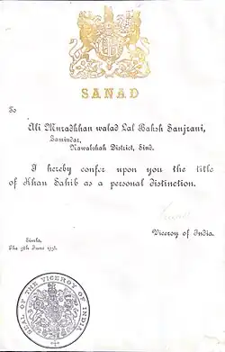 Ali Murad Sanjrani (Sindhi: علي مراد سنجراڻي) K.S, Haji, was a Zamindar (landowner) and factory owner. Ali Murad was born in 1895 in his native village of Barhun. Fluent in Sindhi and Seraiki, he belonged to the prominent Sanjrani tribe, originally from Dera Ghazi Khan, Punjab. The tribe migrated during the Kalhora dynasty of Sindh and settled in their current village. He was awarded title of Khan Sahib in the 1930s.[1] He was also Chairman of Farmer Organization.[2]