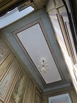 The interior space of the residential building is especially saturated with artistically executed interiors including the vast lobby of the two-story staircase outside the front rooms, ornamented with decorative panels with landscapes and genre scenes made by the architects-designers and painters who worked here. From the mezzanine, a wide glazed corner gallery leads to all the ceremonial rooms.[2]