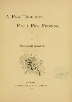 Alice Arnold Crawford (née, Arnold; February 10, 1850 – September 1874) was a 19th-century American author of poetry and short stories. She furnished articles in prose and verse for the leading publications of the day. After her death, an unedited collection of her writings, totaling almost two hundred pages, mostly in verse, was published in 1875 by Jansen, McClurg & Co., of Chicago.[1]