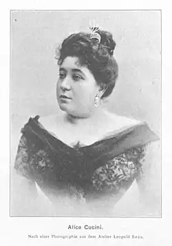 Alice Cucini (1870–1949) was an Italian contralto who had a prolific opera career in Europe and South America between 1891 and 1915. She was particularly associated with the role of Dalila in Camille Saint-Saëns's Samson et Dalila, which she sang in numerous houses internationally. Among the first generation of musicians to be recorded, her voice is preserved on some of the first Zonophone records ever made (1900), some Pathé recordings from 1902, and some His Master's Voice recordings made in 1906 and 1910.