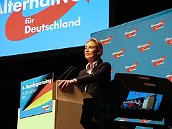 Weidel joined the Alternative for Germany (AfD) in October 2013.[23] According to Weidel, she was first attracted to the party due to her opposition to the euro.[24] She was elected to the federal executive committee of the AfD in June 2015.[25] In April 2017, she was elected co-lead candidate of the party.[15] She is the first lesbian to serve as a lead candidate of her party.[26] She has been identified by the media as belonging to the more moderate conservative Alternative Mitte faction within the AfD.[27][28]