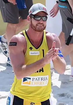 Alison Conte Cerutti (born 7 December 1985), known as Alison Cerutti or simply Alison, is a Brazilian beach volleyball player. He plays as a blocker.[2] In 2011, along with Emanuel Rego he won the Swatch FIVB World Tour in Prague, Czech Republic.[3] and the silver medal at the 2012 Summer Olympics.[4] He won the gold medal at the 2015 World Championships in Netherlands.[5] and the gold medal at the 2016 Summer Olympics in Rio alongside teammate Bruno Schmidt.[6] In 2019, Alison partnered with Álvaro Morais Filho. The team won their first gold medal at the FIVB Kuala Lumpur event. The duo also competed in the Tokyo 2020 journey. Since 2021 Alison has been playing with Guto Carvalhaes.