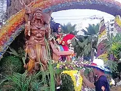 Aliwan Fiesta is divided into three categories: Cultural Street Dance Competition (the main event), Float Parade, and Reyna ng Aliwan (Queen of Entertainment/Amusement) competition. Each of the country's 17 regions have the option to send up to two contingents representing its respective cultural festival, as well as an option to send a representing float and or Reyna ng Aliwan contestant.[4] However, the roster of entries for the cultural dance and float competitions are limited. In 2008, the number of slots for cultural dance was increased from 20 to 24 groups, which was completed as early as January.[3] Each contingent in the cultural street dance competition—totaling up to 100 dancers as well as hundreds of musicians and support staff members—have undergone stringent elimination cycles during various local festivals before being chosen to compete in Aliwan Fiesta.[1] The highlight of the event is when all competing festivals show off their dance skills while parading for four kilometers (about 2+1⁄2 miles) along Roxas Boulevard from Quirino Grandstand to Aliw Theater grounds located near CCP.[5] The festivals range from the well-known such as Dinagyang of Iloilo City, Sinulog of Cebu City, and Panagbenga of Baguio, to the obscure but just-as-interesting feasts like Alikaraw of Hilongos, Leyte, Padang-Padang of Parang, Shariff Kabunsuan, and Pamitinan Festival of Rodriguez, Rizal.[1] Side events also include a bazaar featuring different regional products, a photography contest, an inter-scholastic dance competition (interpreting dance tunes played on MBC radio stations), Filipino street games, and a fireworks display.[5][6]