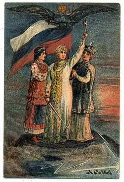 The All-Russian nation or All-Russian people (Russian: общерусский народ) or triune Russian people (Russian: триединый русский народ), also called the triune Russian nation or pan-Russian nation, is the term for the Imperial Russian and modern Russian irredentist ideology[1][2] that sees the Russian nation as comprising a "trinity" of sub-nations:[3][4][5] Great Russia, Little Russia, and White Russia,[6] which are contextually identified with Russians, Ukrainians, and Belarusians respectively. Above all, the basis of the ideology's upholding of an inclusive Russian identity is centered around bringing all East Slavs under its fold.[7][8]