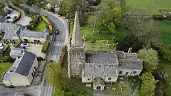 The church has a west tower with corner pinnacles and gargoyles and has an octagonal spire 100 feet (30.5 metres) tall.