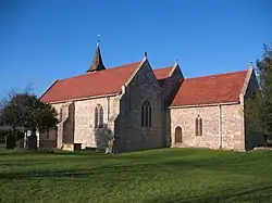The church was originally built around the time of the Norman Conquest, and it was recorded in the Domesday Book.[1] It has sometimes been described as Saxon, although little material survives from this date - principally, some carved stones set into the wall, and two reset window heads, and possibly the round chancel arch. The nave was rebuilt in the 13th century, and the chancel in the 14th century, when a south aisle was also added to the church. In 1773, the church was restored and partly rebuilt, and the chancel was again rebuilt in 1843. In 1898, C. Hodgson Fowler undertook a major restoration, in which, the brick tower was taken down and replaced by a bell turret, the roof was replaced, and a new east window was added, along with a south porch.[2][3]