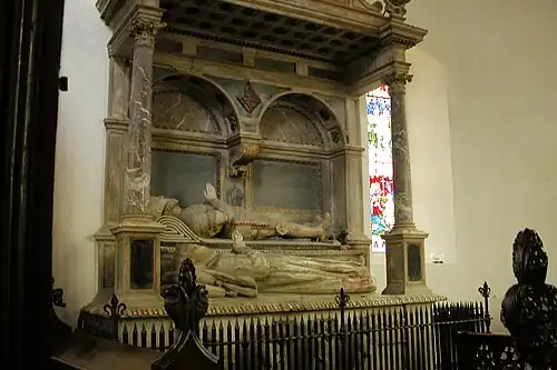 The Reformation in England began in about 1530 when Henry VIII separated the English Church from the papacy. Significant for Wing was the abolition of the monasteries, since 1528, the Priory of St. Mary de Pre, to which Wing still belonged, was dissolved. The rights of the Priory were acquired by Robert Dormer, 1st Baron Dormer. The Dormers lived in the Manor of Ascott Hall on the outskirts of Wing, acquired the title Earl of Carnarvon in 1628 and were Wing's most important family until the beginning of the 18th century. Diverse members of the Dormer family are buried in the church, mainly at the eastern end of the northern aisle. Particularly impressive are the tombs for Sir Robert Dormer (died 1552), Sir William Dormer (died 1575) and family and Robert Dormer, 1st Baron Dormer (died 1616) and family.