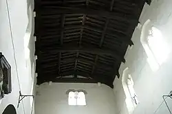 From the 14th century come several glass windows, including a coronation of Mary. From 14th and 15th century, respectively, originate the two entrance buildings in the south and north of the church as well as the doorways in them. The doorway in the southern entrance are decorated with coats of arms, lions and other symbols associated with the patron saints of the church. Also from the 15th century is the baptismal font still in use today. The most important work of art left in the church by the 15th century is the wooden ceiling. Below the gable is a series of excellently carved angels with outstretched wings. The edge of the ceiling is decorated by a variety of figures such as kings, queens, musicians and devils.