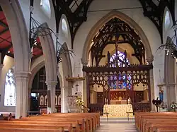 The nave and south aisle were finished first, the tower and chancel were added in 1867, while the north aisle was not fully roofed until 1906. The church has always been noted for its bells; the first was the tenor bell, which was presented by Thomas Alcock and was rung on the day the church was consecrated. The framework for a complete peal was fixed in the tower in 1877. Another bell was added the same year, and a third the year after. By 1882 there were six and all eight were inaugurated on 1 November 1893 (All Saints Day).[3][4][5]