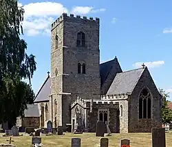 The tower is made up of three stages. The lower, 13th century stage has clasping buttresses. The lower and middle stages have lancet windows. The middle stage has east, west and north windows that date to the early 13th century. The top stage, added in the 15th to 16th centuries, has a battlement parapet and 2-light windows with cusped tracery. The west facade of the church has three steep gables, each with 3-light windows. The south porch is gabled and flanked by gabled buttresses.[2]