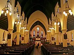 In 1853, the vestry of All Saints' Parish appointed a building committee to oversee the construction of a third, larger church. After corresponding with the firm of Richard Upjohn and Company of New York, plans for the new Gothic Revival-styled church were procured and the cornerstone was laid in 1855. The form of the new church incorporated a long nave with side aisles leading to a recessed chancel. A tall bell tower and spire was centered on the front facade, becoming a part of Frederick's famed "Clustered Spires." The construction was completed in 1856 and this church has been in continuous use by the parish since then.[10] The 1814 building, which sits perpendicular to the third building, was converted for use as a parish hall.