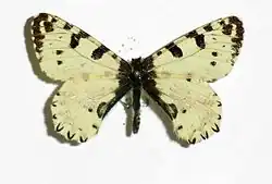 The Allancastria cretica imago is a medium-sized ( 50–60 millimetres (2.0–2.4 in) long.,[1] white to ochre-white butterfly with black markings, a line of submaginal scallops, and a few red dots on the hindwings. Seitz_-cretica Reb. (9e) occurs on Grete and some Greek islands; a sparsely marked form in which the three teeth of the hindwing mentioned above (A.cerisyi) are indicated only by black curved lines, the edge of the wing not being distinctly excised. Not so common as cerisyi.[2]