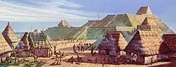 Various recorded Native American traditions portray the Allegewi as a people of immense stature, credited with the creation of large mounds and fortified earthworks throughout the region.[1] Some versions suggest that their expulsion opened the land for settlement by the Delaware and Iroquois, and that the Allegewi may have been identical with the mysterious Mound Builders whose remains are found across the Mississippi and Ohio river basins.[2]