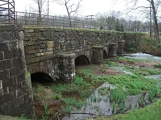 Allegheny Aqueduct, also known as Gibraltar Aqueduct, is a historic stone aqueduct located at Robeson Township in Berks County, Pennsylvania. It was built in 1824 and is about 260-foot-long (79 m) and 70-foot-wide (21 m). It was built as part of the Schuylkill Navigation Company canal system to carry canal boats across the Allegheny Creek. It is supported by a stone arch bridge structure with five spans. The aqueduct was in operation until 1928 and drained in 1967.[2]