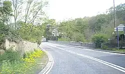There are two small waterfalls to the west of Allensford on streams running south-to-north into the River Derwent. About 400m to the west on Allensford along a public footpath is Wharnley Burn Waterfall[10] on the Wharnley or Watergate Burn, pictured in this article. The footpath crosses a small bridge below the waterfall and continues south west into woodlands and eventually to farmland below Castleside.