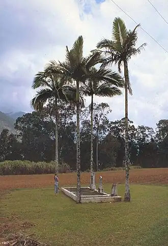 The Alley Family Graves site consists of three headstones and three plaques set on a concrete platform containing the graves of six family members. The concrete platform is framed by four palms, and the graves site is located fronting the Gillies Highway to the northwest, and surrounded by sugarcane fields to remaining three sides.[1]