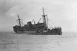 Twenty merchant ships were lost in Axis naval activity in Australian waters in 1942.[49] In an air raid on Port Moresby on 17 June 1942, the 12,920-cubic-metre (4,561 grt) MV Macdhui was hit and set ablaze; three crewmen and a member of the Army working party were killed. A second air raid the following day scored more direct hits on the ship, which burned fiercely, and was a total loss.[52][53] Five more members of the crew were killed and one fatally injured. Another 63 men were injured in the attack, including the master, Captain James Campbell.[54] Two ships were attacked by Japanese submarines in the Gulf of Papua. The Ro-33 sank the 850-cubic-metre (300 grt) MV Mamutu by gunfire on 6 August 1942, and machine gunned survivors in the water. Of Mamutu's 142 passengers and crew, 114 were lost.[55] Ro-33 struck again on 29 August, torpedoing the 9,400-cubic-metre (3,310 grt) MV Malaita, which was returning to Cairns after delivering troops and supplies to Port Moresby. Although listing ten degrees to starboard, Malaita remained afloat, and was taken in tow by MV Matafele and HMAS Potrero. Their escort, the destroyer HMAS Arunta, picked up an ASDIC contact on the Ro-33, and delivered a series of depth charge attacks and sank it.[56]