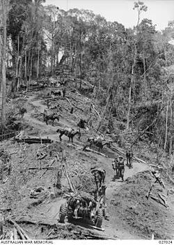 Meanwhile, the 1st Pack Transport Company was formed at Royal Park in Melbourne on 25 August. It had entrained for Queensland on 25 September, and arrived in Port Moresby on 7 October. In late October it began relieving the 1st Light Horse Troop.[111] By the end of October, the 1st Pack Transport Company had one officer and 110 other ranks with 43 mules and 135 horses working on the track.[110] The 1st Light Horse Troop was relieved on 5 November, and was reorganised as the New Guinea Force Pack Transport Company. It was later renamed the 7th Pack Transport Company.[105] In all, some 643,330 kilograms (1,418,310 lb) of supplies were moved forward of the jeephead by animal transport.[110][110]