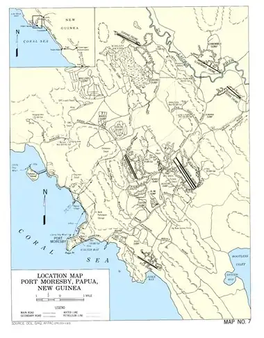 Eight ships bound for Port Moresby were lying idle off Townsville or Cairns on 12 October, waiting to be called forward. General Headquarters (GHQ) SWPA estimated that at the current rate of discharge it would take two weeks before they were called forward. Ironically, five of them were carrying equipment and stores needed to upgrade the port facilities.[69] Extending the wharf required pilings and heavy timbers that were not immediately available.[68] Matthews decided on a bold plan. Tatana Island, about 5 kilometres (3 mi) west of Port Moresby, had deep water off its northwest side. About 0.80 kilometres (1⁄2 mi) offshore, it was separated from the mainland by shallow water with a coral reef bottom. He proposed taking the 2nd Battalion, 96th General Service Regiment off its work on aerodrome maintenance and refuelling and rearming aircraft, and use them to construct a causeway from the mainland to Tatana Island, where pontoon docks could be built. The materials required were immediately available, but doubts were expressed about whether a causeway could withstand the force of storms and tides. Lacking boats for a hydrographic survey, one was conducted by wading during an exceptionally low tide in late September.[70]