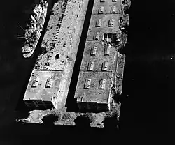 Although the Army had decided to concentrate on the rehabilitation of Marseille, Hewitt resolved to do what he could in Toulon, as preliminary surveys indicated that some berths could be opened in Toulon before Marseille. Like the latter, Toulon had been badly damaged by German demolitions and Allied bombing. Almost all the buildings had been destroyed, the roads had been obstructed, the docks had been damaged and the berths had been obstructed with sunken vessels.[96] The task of reconstruction of Toulon was undertaken by the French Navy and the US Navy's 611th Construction Battalion Maintenance Unit.[90]