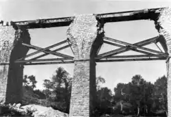 Improvisation was called for. At Aix-en-Provence, the 343rd Engineer General Service Regiment used the 104-foot (32 m) base of a captured German 270 mm railway gun to span two 51-foot (16 m) gaps in the railway bridge there, allowing the first train to cross on 29 August.[103] The same unit built a Bailey bridge over the Durance at Meyrargues, which was opened on 17 September.[104] The final link was completed by the 40th Engineer Combat Regiment, which used a Bailey bridge to replace a 91-foot (28 m) gap in the bridge over the Buëch, and local lumber and steel to replace two other missing spans.[99] By 3 September, freight was being moved by rail from Camel Beach to Meyrargues, then by truck to Sisteron, and by rail to Grenoble.[104]