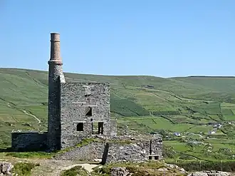 The industrial mines in Allihies date back to 1812 when they were first opened by John Puxley. Mining activity reached its peak there in 1845, when the mines employed around 1600 people, after which the mines suffered with the local area during the Famine.[1] The mines were operational until 1962, when they were finally closed. Large Cornish engine houses were constructed around the mining site, ruins of which survive today. These were used to pump out water to allow for deeper mining, and to transport miners and equipment down shafts that went below sea level.[2] The site still contains a number of engine houses, mining shafts and a church. These were constructed by and for the Cornish miners who were brought to the area in the 1800s to mine copper ore.[3] Once the mine became unprofitable, many of the miners emigrated to Butte, Montana.[4][1]