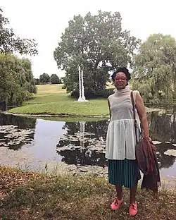 ![]() Hamilton in front of her installation, "The peo-ple cried mer-cy in the storm," at Storm King Art Center in 2018 | |