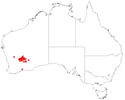 Subspecies eriochlamys grows in mallee woodland on stony slopes between Comet Vale and Kalgoorlie in the Coolgardie and Murchison bioregions[11][14] and subsp. grossa grows around granite outcrops, mainly near Norseman in the Coolgardie and Nullarbor bioregions of Western Australia.[13][15]