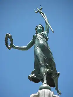 Alma de Bretteville met her future husband thanks to a rumor that she modeled for the Dewey Monument by Robert Aitken, which can be found in Union Square. One version of the story holds that Aitken hired Alma de Bretteville Spreckels, who had modeled for Aitken previously, to model for the statue. However, a 1902 article detailing the monument's construction states that Aitken's model was Clara Petzold[3] or Petzoldt, a popular artists' model in San Francsico at that time.[4] Regardless, this statue was selected from a number of entries and only barely made the cut, thanks to the crucial vote of the chair of the Citizens' Committee, Adolph B. Spreckels. Although he was 24 years older than she was, he was smitten by Alma, and after a five-year courtship, they married on May 11, 1908.[1]