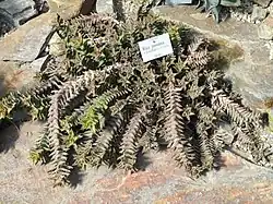 Aloe juvenna has many short, straight, compact triangular leaves, which are densely packed all along the stems. It is common in cultivation but extremely rare in habitat. Aloe juvenna is also a tetraploid, with a double set of chromosomes (28, instead of 14) and, in appearance, does not resemble any other Aloe species from the region.[5][6]