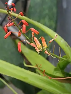The flowers are similar to those of other Mascarene aloes. They appear on inflorescences, with a 10–12 cm peduncle splitting into two or three 15–30 cm racemes - usually all branching from the same point. Its pale orange-red flowers grow on the subdense cylindrical racemes. Its seeds develop in fleshy berries, which are teardrop shaped, 1.5 – 2 cm long and contain a dark liquid.[2]