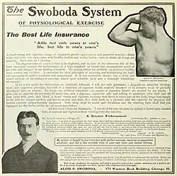 Swoboda managed to dupe Woodrow Wilson into using his exercise system during 1901 and 1902.[2] Swoboda's system was advertised in Harper's Weekly, Pearson's Magazine and Popular Mechanics.[3][4][5]