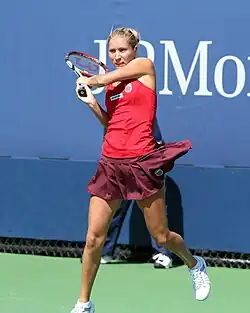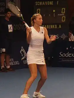 Alona started her clay-court season at Amelia Island. Seeded second, she lost in the first round to eventual finalist Olga Govortsova.[8] In Charleston at the Family Circle Cup, Alona was the ninth seed. She reached the third round after wins over Julie Ditty and Bethanie Mattek-Sands. She was defeated in her third-round match by seventh seed and eventual finalist Vera Zvonareva.[9] In the Fed Cup tie against Australia, Alona lost her match to Anastasia Rodionova.[10] Ukraine ended up losing to Australia 0–5. After playing Fed Cup in Ukraine, Alona flew to Madrid to compete at the Madrid Open. In the first round, she came back from a set down to defeat Magdaléna Rybáriková. She then gained the biggest win of her career by defeating world No. 2, Caroline Wozniacki in the second round.[11] Alona was defeated in the third round by 13th seed Li Na.[12] Seeded sixth at the Warsaw Open, Alona was upset by qualifier Gréta Arn in the quarterfinals. Seeded 27th at the French Open, Alona reached the third round for the first time, but she lost to fourth seed Jelena Janković.[13]