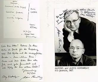 Aloys (14 May 1931 – 22 August 2017)[1][2] and Alfons (9 October 1932 – 5 May 2010)[3][4] Kontarsky were German duo-pianist brothers who were associated with a number of important world premieres of contemporary works. They had an international reputation for performing modern music for two pianists, although they also performed the standard repertoire and they sometimes played separately. They were occasionally joined by their younger brother Bernhard in performances of pieces for three pianos. After suffering a stroke in 1983, Aloys retired from performing.
