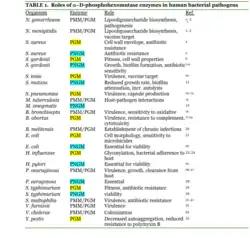 - ^ McCarthy TR, Torrelles JB, MacFarlane AS, Katawczik M, Kutzbach B, Desjardin LE, Clegg S, Goldberg JB, Schlesinger LS (November 2005). "Overexpression of Mycobacterium tuberculosis manB, a phosphomannomutase that increases phosphatidylinositol mannoside biosynthesis in Mycobacterium smegmatis and mycobacterial association with human macrophages". Molecular Microbiology. 58 (3): 774–90. doi:10.1111/j.1365-2958.2005.04862.x. PMID 16238626.