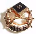 The Alpha Kappa Kappa badge was a gold crescent with the letters, Α, Κ, and Κ, enameled in black. Wrapped around the crescent are twin coiled serpents facing each other. The horns of the crescent support an enameled black book bearing the letter(s) of the chapter. (In the infobox, a photographic example shows a pin from the Mu chapter at the University of Pennsylvania.) The book may be set in pearls and emeralds, which were the fraternity's jewels. The name of the school was sometimes etched onto the side of the book, which was held at a diagonal.
