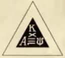 There are two different descriptions of the Alpha Kappa Psi badge. One describes the badge as "an equilateral triangle bearing in the angles of the Greek letters".[2] The other describes it as "a triangle divided into three panels, one displaying a scroll carrying a skull and bones, one a key and the third a torch".[3][4]