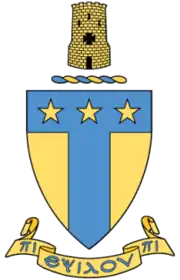 Alpha Tau Omega's colors of azure blue and gold.[7][8] Its flower is the White Tea Rose.[8] Its symbol is the Heraldic Cross Pattee.[7] Its motto is πι εψιλον πι.[7] Its slogan is Love & Respect.